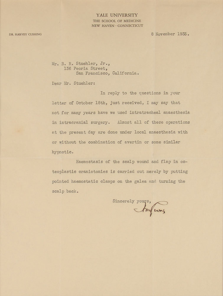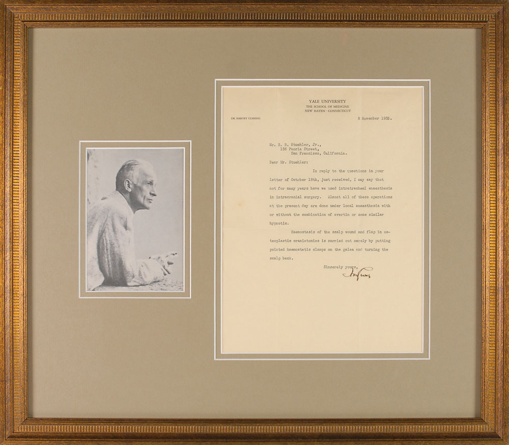 Surgeon (1869–1939) who pioneered many modern neurosurgical techniques and investigated the functions of the pituitary gland. TLS, one page, 7.75 x 10, Yale University letterhead, November 8, 1935. Letter to B. R. Stuehler, Jr. In full: “In reply to the questions in your letter of October 18th, just received, I may say that not for many years have we used intratracheal anaesthesia in intracranial surgery. Almost all of these operations at the present day are done under local anaesthesia with or without the combination of avertin or some similar hypnotic. Haemostasis of the scalp wound and flap in osteoplastic craniotomies is carried out merely by putting pointed haemostatic clamps on the galea and turning the scalp back.” Tastefully double-matted and framed with a photo of Cushing to an overall size of 19.5 x 17. In fine condition, with intersecting folds (one vertical fold passing through a single letter of the signature). Accompanied by the original mailing envelope. Incredible content regarding the development of brain surgery, the field that he pioneered. RR Auction COA.