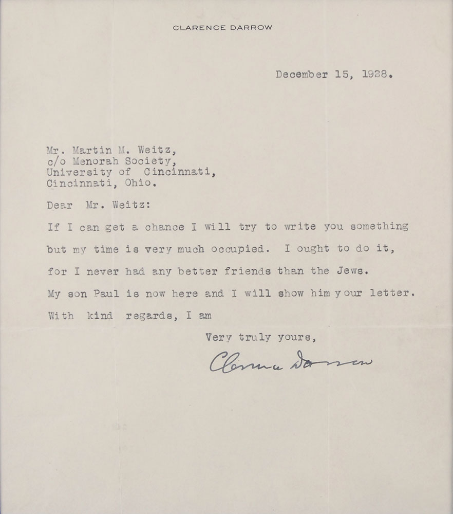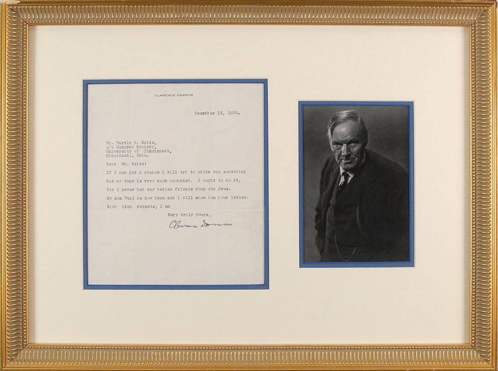 TLS, one page, 7 x 8, personal letterhead, December 15, 1938. Letter to Mr. Martin M. Weitz of the Menorah Society. In full: “If I can get a chance I will try to write you something but my time is very much occupied. I ought to do it, for I never had any better friends than the Jews. My son Paul is now here and I will show him your letter.” Double-matted and framed with a photo of Darrow to an overall size of 19 x 15. In fine condition, with intersecting folds (one vertical fold passing through a single letter of the signature). Pre-certified PSA/DNA and RR Auction COA.