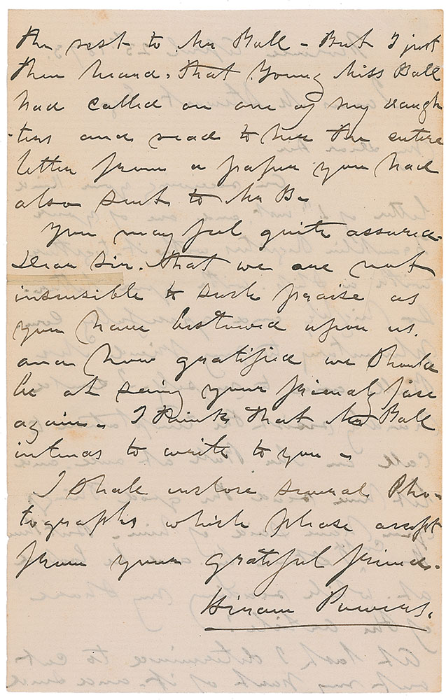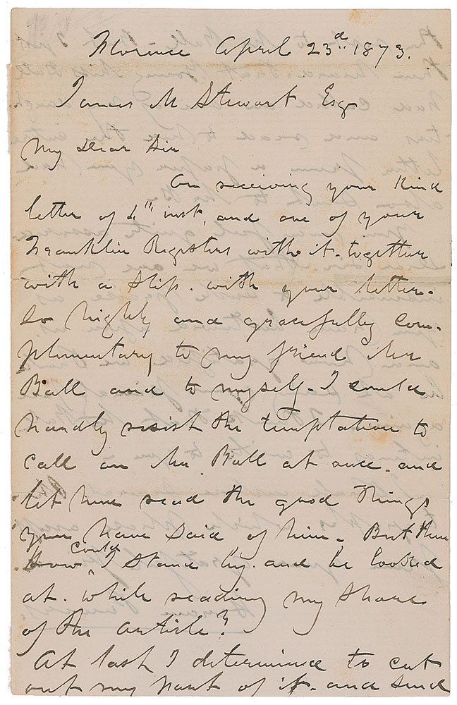 American neoclassical sculptor (1805-1873). ALS, one page both sides, 5.25 x 8.5, April 23, 1873. Letter to James Stewart thanking him for a letter “so…complimentary to my friend Mr. Ball and to myself” and notes, “I could hardly resist the temptation to call on Mr. Ball at once and let him read the good things you have said of him. But then how could I stand by as he looked…while reading my share of the article?” In fine condition, with a bit of scattered light toning and a few small tape repairs along horizontal folds. Pre-certified PSA/DNA and RR Auction COA.