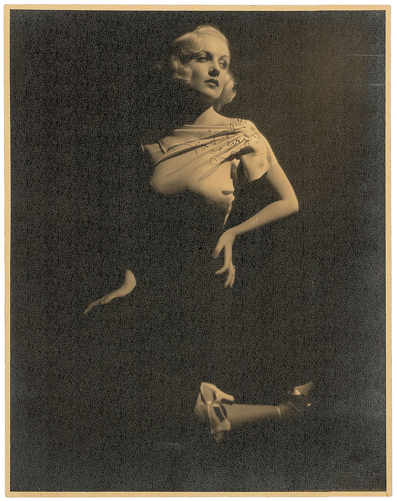 Magnificent vintage matte-finish 10.5 x 13.5 full-length portrait of Lombard emerging from the shadows in a gorgeous light gown, signed and inscribed in fountain pen, “To Bob, as ever, Carole.” Blindstamped in the lower right by famed Hollywood photographer Otto Dyar. Scattered surface creases, light contrast to portions of the signature, and slightly trimmed edges, otherwise fine condition. A remarkable image of one of Hollywood’s most legendary and sought-after stars. Pre-certified PSA/DNA and RR Auction COA.
