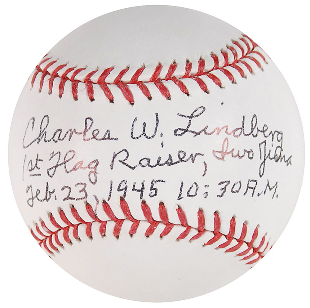 Official Rawlings Major League baseball signed in black ballpoint on the sweet spot, “Charles W. Lindberg, 1st Flag Raiser, Iwo Jima, Feb. 23, 1945 10:30 A. M.” In very fine condition. An especially rare format, this is only the second Lindberg baseball we have offered. Pre-certified PSA/DNA and RR Auction COA.