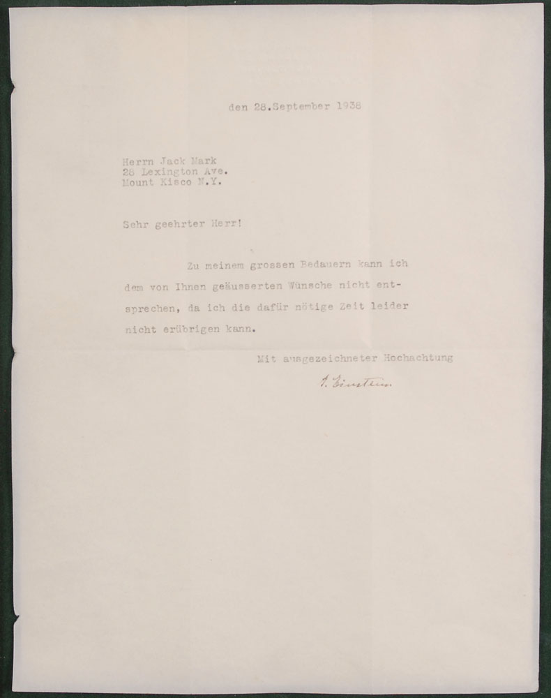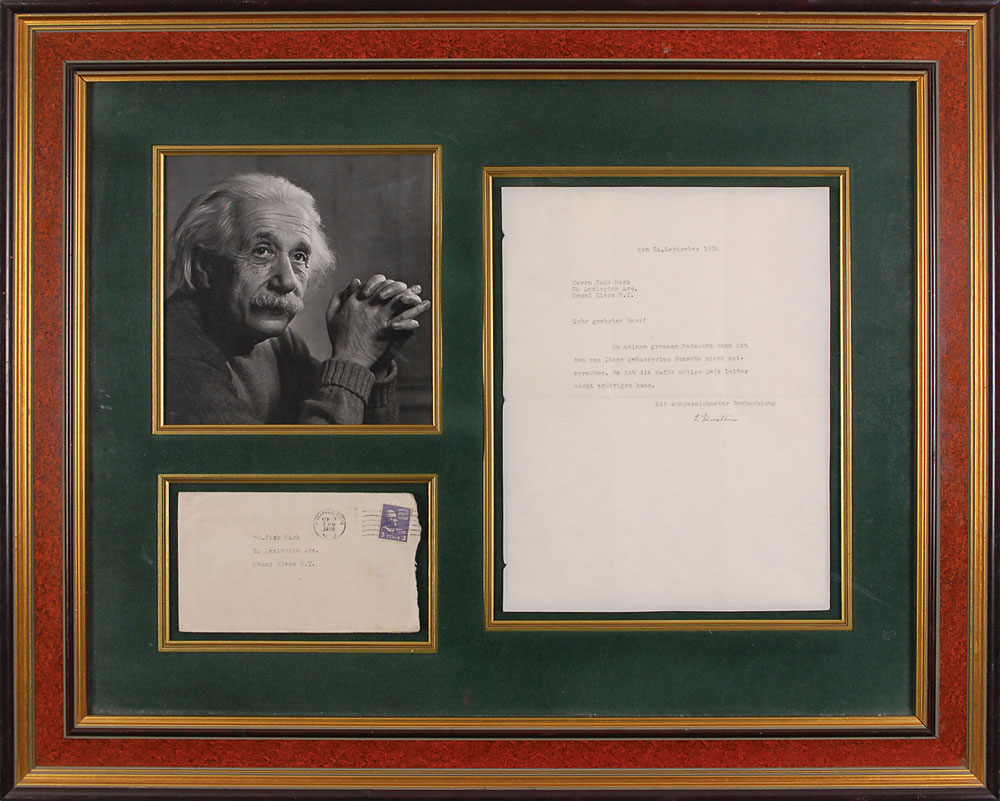 TLS in German, signed “A. Einstein,” one page, 8.25 x 1, blind-stamped personal letterhead, September 28, 1938. Letter to Jack Mark in Mount Kisco, New York. In full (translated): “Dear Lord! To my great regret, I can not comply with your expressed wishes, as I unfortunately can not spare the time necessary for it.” Nicely suede-matted and framed with the original mailing envelope and a portrait of Einstein to an overall size of 25.25 x 20.5. In fine condition, with intersecting folds, one through a single letter of signature, and three small dings to left edge. Oversized. Pre-certified John Reznikoff/PSA/DNA and RR Auction COA.