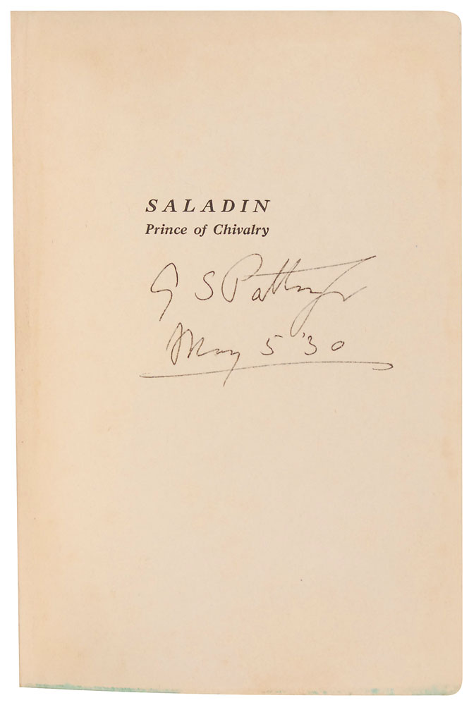 Signed book: Saladin: Price of Chivalry. First edition. NY: Charles J. Rosebault, 1930. Hardcover, 6 x 8.5, 305 pages. Signed on the half-title page, “G. S. Patton, Jr., May 5 ‘30.” Also signed on the front cover, “G. S. Patton, Jr.,” and on the spine “Patton.” Autographic condition: very good, with signature on the spine faded and lightly stained, some mild toning to half-title page, and cover and opening pages toned and dampstained from a fire in the Patton house. Book condition: G+/None, in VG+ custom-made case. No other military leader wrote so frequently in his letters or diary what he was reading, and no leader’s library was so well documented since Napoleon’s. Patton’s library, which was almost entirely inherited by his son, Major General George Patton III, was given to West Point, with just a small portion of books, including this one, inherited by other descendants or friends.