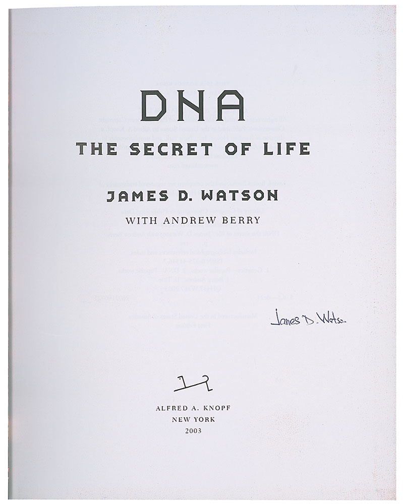 Signed book: DNA. First edition. NY: Alfred A. Knopf, 2003. Hardcover with dust jacket, 7.75 x 9.5, 446 pages. Signed on the title page in black ballpoint. In fine condition. Pre-certified PSA/DNA and RR Auction COA.