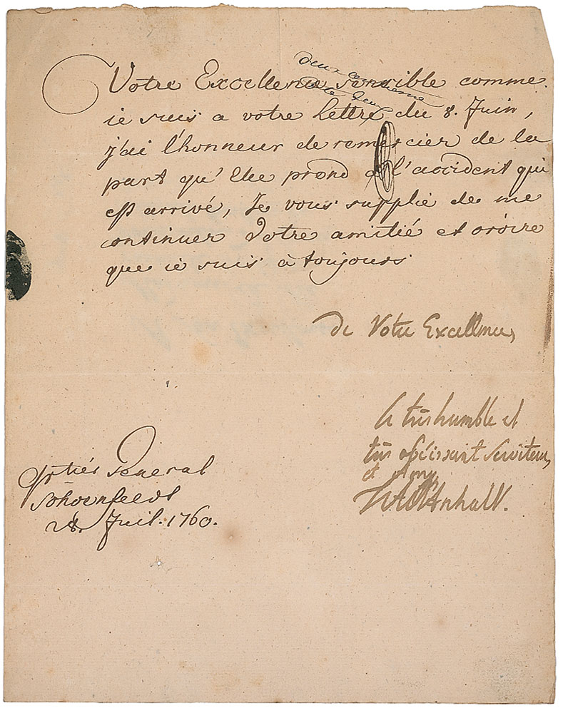 German prince of the House of Ascania (1734-1793), the last ruler of Anhalf-Zerbst, and the younger brother of Russian leader Catherine the Great. LS in French, signed “Anhalt,” one page, 7 x 9, July 28, 1760. Untranslated letter to Madame La Marchalle, with a closing written in Anhalt’s own hand, as well as a docketing notation to reverse of the second integral page in his hand. In very good condition, with a couple of ink notations and cancellations over text, intersecting folds, ink cancellation over docketing, and mild toning. RR Auction COA.