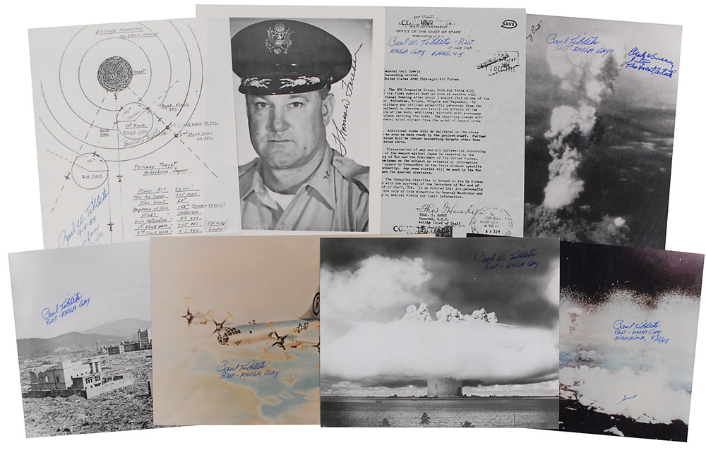 Nice grouping of eight items, all approximately 8 x 10 or 10 x 8, signed by figures associated with the Enola Gay, including: Paul Tibbets, Charles W. Sweeney, and George W. Marquardt (SP); Paul Tibbets (four photos, one souvenir typescript); Paul Tibbets and Jacob Beser (souvenir typescript); and Tom Ferebee (SP). In overall fine condition. RR Auction COA.