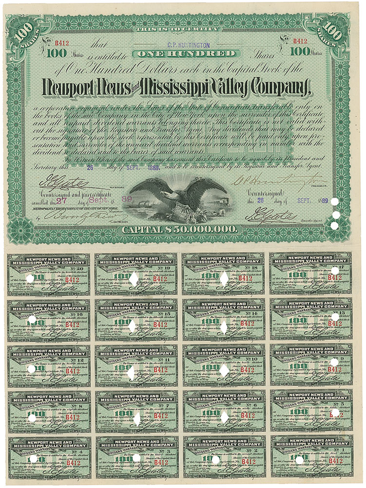 DS, signed “C. P. Huntington,” one page, 11.5 x 15.5, September 26, 1889. Attractive stock certificate for 100 shares of the Newport News and Mississippi Valley Company, signed at the bottom by Huntington as the company’s president. Bottom half of the certificate bears a complete sheet of 20 coupons. In fine condition, with expected document wear and cancellation holes to the lower right corner and all coupons. Pre-certified PSA/DNA.