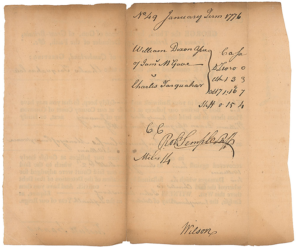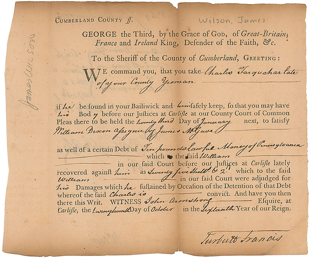 Revolutionary War–dated ink endorsement, “Wilson,” on the reverse of a partly-printed document, one page, 8 x 6.75, October 27, 1776. The document orders Charles Farquahar to appear in court to testify regarding a debt dispute. In very good condition, with a central vertical fold, moderate toning, and a few creases. Pre-certified John Reznikoff/PSA/DNA and RR Auction COA.