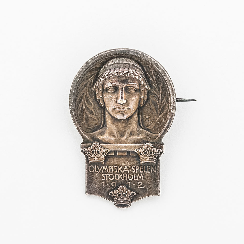 Original 1912 ‘Jim Thorpe’ Summer Olympics participation badge. Attractive silvered lapel pin badge, made by Sporrong & Co. of Stockholm measures 25mm x 37mm with a Greek athlete’s head at the top, and “Olympiska Spelen, Stockholm 1912,” in raised letters at the bottom. Reverse bears an impressed maker’s mark. In fine condition.