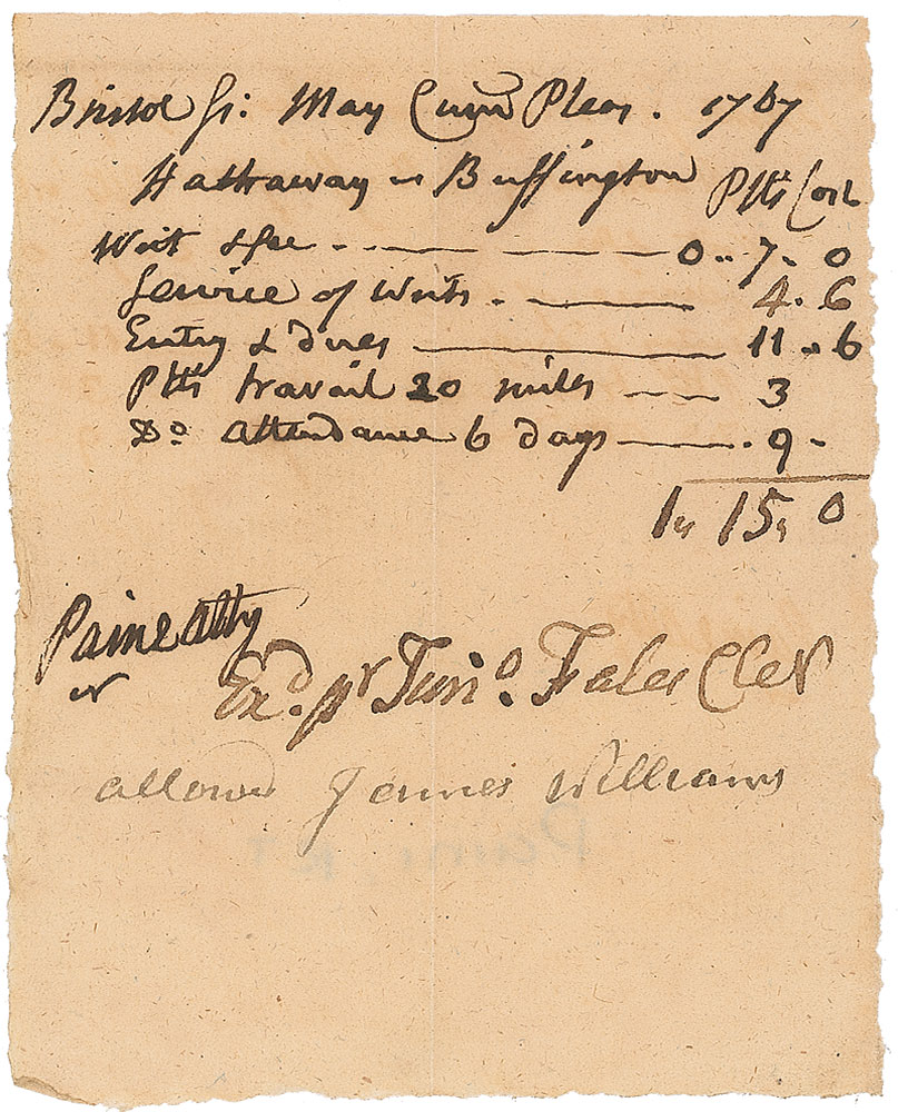 ADS, signed “Paine Atty,” one page, 3 x 3.75, 1767. Bill for his legal services in the amount of £1.15.0, including charges for “writ & fee,” “service of writ,” “entry & dues,” and “attendance 6 days.” In fine condition, with a central vertical fold. Pre-certified John Reznikoff/PSA/DNA and RR Auction COA.