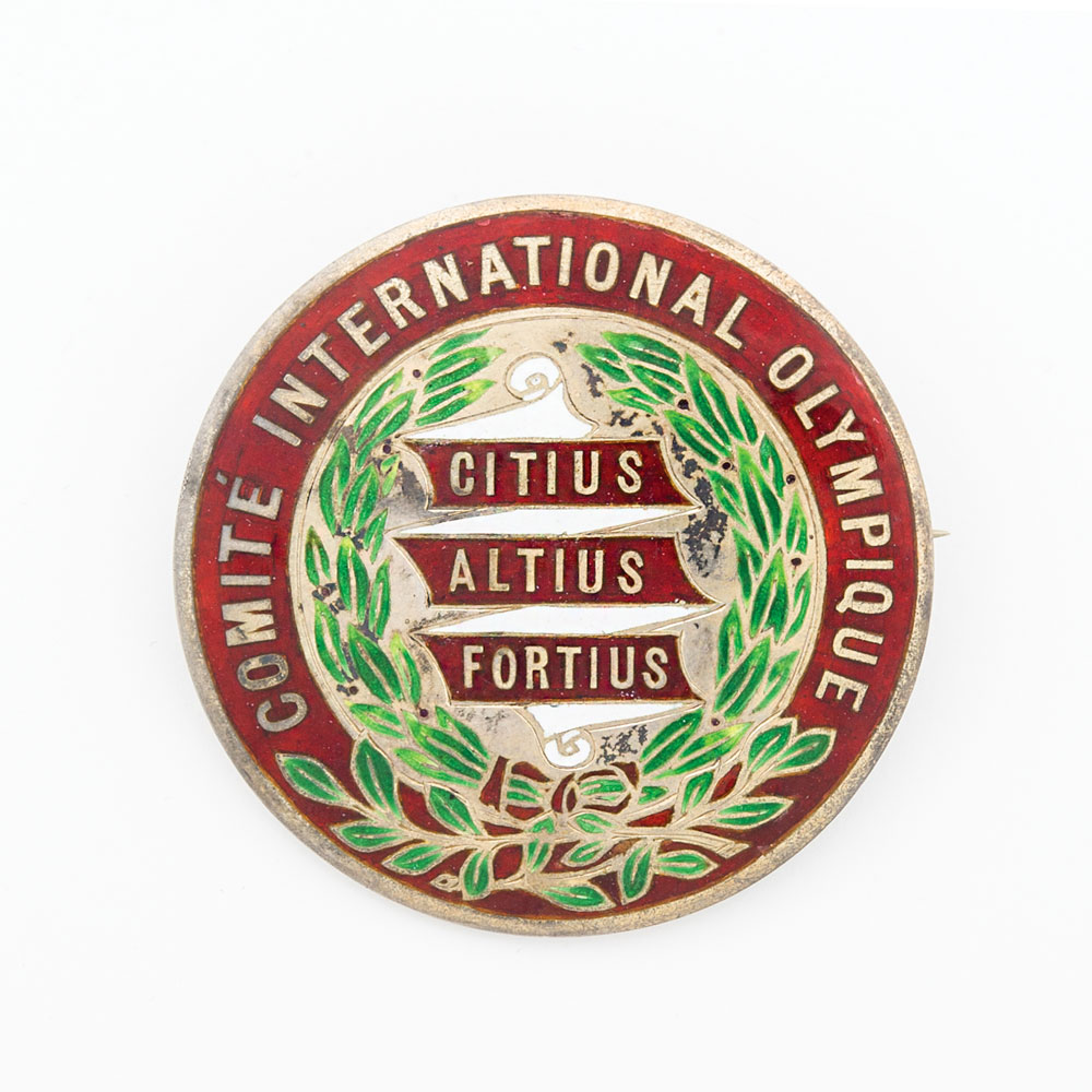 Rare International Olympic Committee (IOC) badge, circa 1912, which was personally owned and worn by noted Harvard athlete and Olympic Committee member E. Jansen Wendell. Gold-plated badge, enameled in silver, green, and red, measures an impressive and eye-catching approximate 2″ in diameter. Printed around the outside edge is “Comite International Olympique,” with the Olympic motto in the center of the badge, “Citius, Altius, Fortius [Swifter, Higher, Stronger].” Badge is marked on the reverse by Birmingham maker Vaughton and Sons and bears the appropriate hallmarks. In choice condition. Scarce in its own right, the desirability of this piece is heightened by the athletic fame of its original owner. As an athlete, Evert Jansen was the first human ever clocked at 10 seconds or better in the 100. Even more impressive when one considers that they used no starting blocks when young Wendell accomplished such a feat back in 1880. A stunning IOC badge and Olympic collecting rarity.