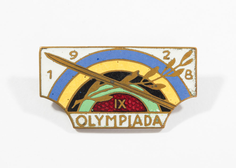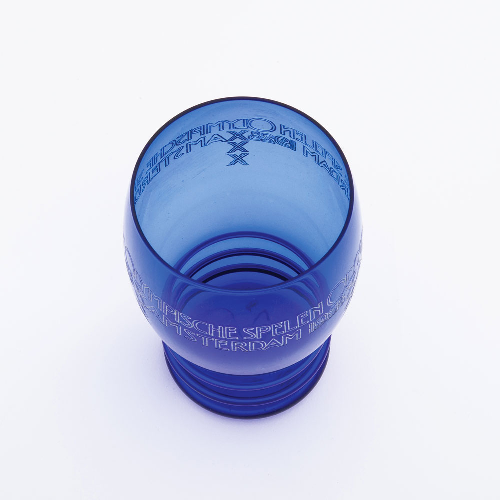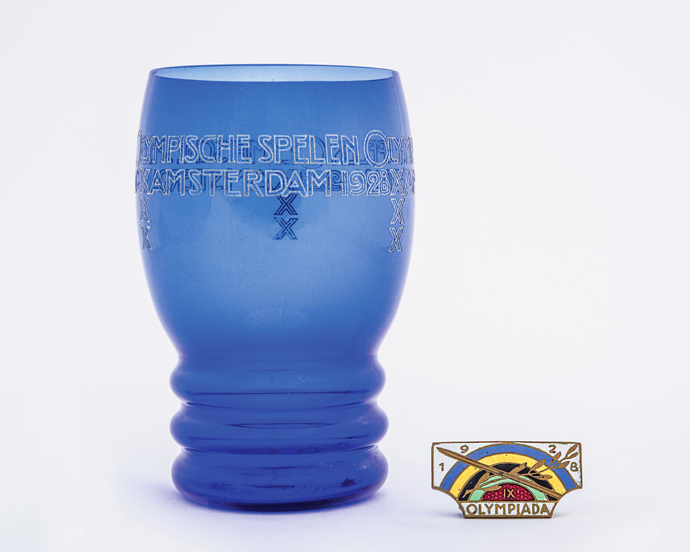 Original commemorative glass from the 1928 Summer Olympics held in Amsterdam, Netherlands. Attractive blue glass measures 4.5″ high, with a 2.5″ diameter opening, with two rows of carefully etched information around the outside; and an original 1.25″ commemorative pin for the 1928 Summer Olympics Czechoslovakian team, most likely for fencing. In fine condition, with a bit of light paint loss to a few letters of etching.