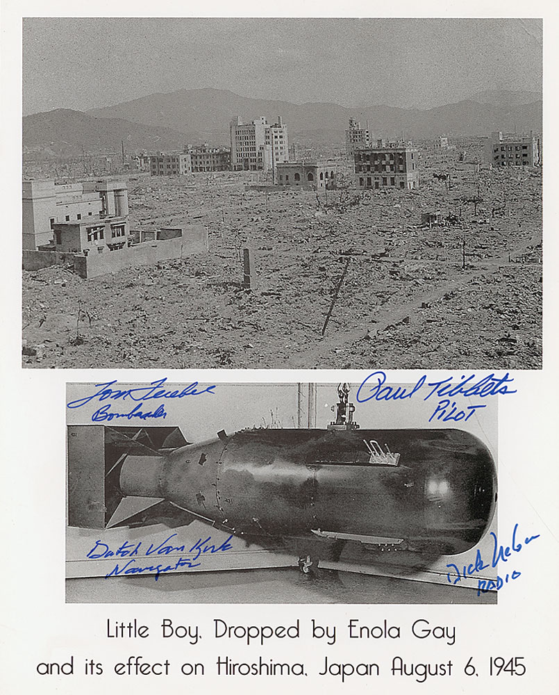Composite 8 x 10 cardstock photo of Little Boy and its devastating aftermath in Hiroshima, signed in blue felt tip, “Paul Tibbets, Pilot,” “Tom Ferebee, Bombardier,” “Dutch Van Kirk, Navigator,” and “Dick Nelson, Radio.” In fine condition. Pre-certified PSA/DNA and RR Auction COA.