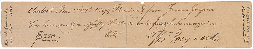 Signer of the Declaration of Independence and of the Articles of Confederation as a representative of South Carolina (1746–1809). Manuscript DS, signed “Tho’s Heyward,” one page, 7.75 x 1.5, November 28, 1799. Financial document concerning the receipt of a loan from a gentleman for “Two hundred and fifty dollars to be paid to him again.” A complete separation to a central vertical fold repaired with tape on the reverse, otherwise very good condition. Pre-certified John Reznikoff/PSA/DNA and RR Auction COA.