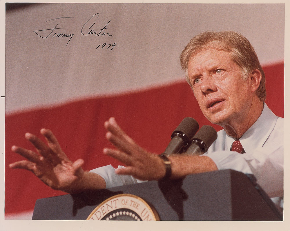 Official White House color satin-finish 10 x 8 photo of President Carter speaking at a podium, boldly signed in black felt tip, as president and dated as such, “Jimmy Carter 1979.” In very fine condition. An unusual presidential pose, not often seen.