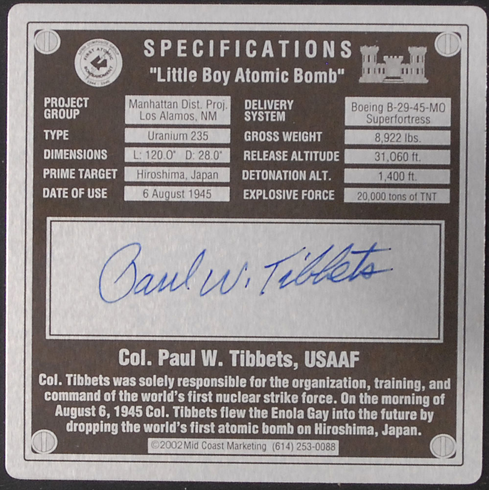 Detailed cast plastic scale model of the ‘Little Boy’ atomic bomb dropped over Hiroshima, 10 x 3 x 2.5, affixed to its original painted 17 x 6 wooden base, signed in blue felt tip on the accompanying placard detailing the bomb’s specifications. In very fine condition. Pre-certified PSA/DNA and RR Auction COA.