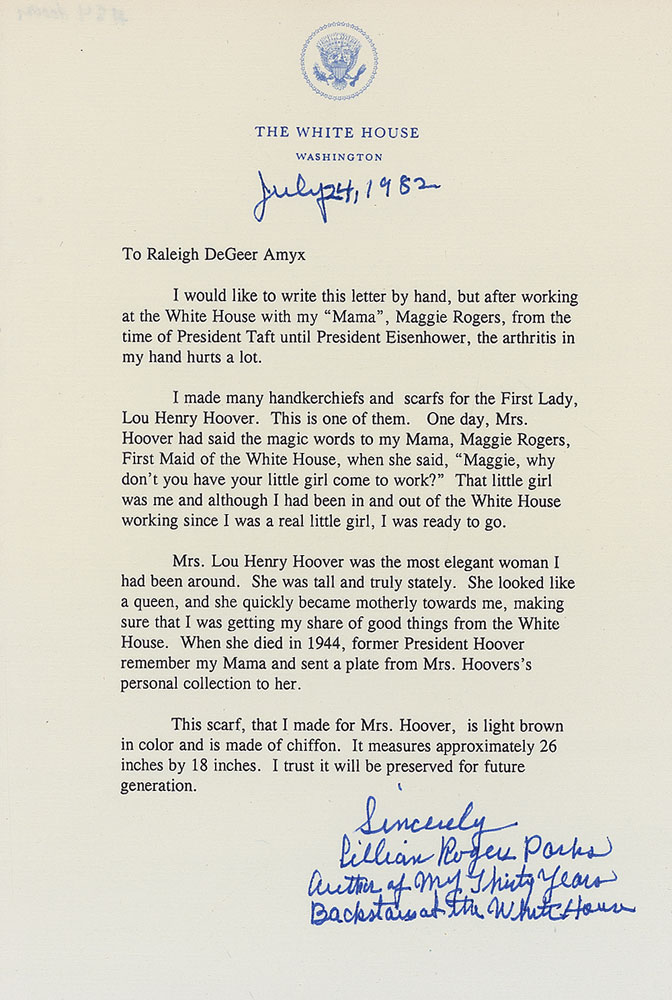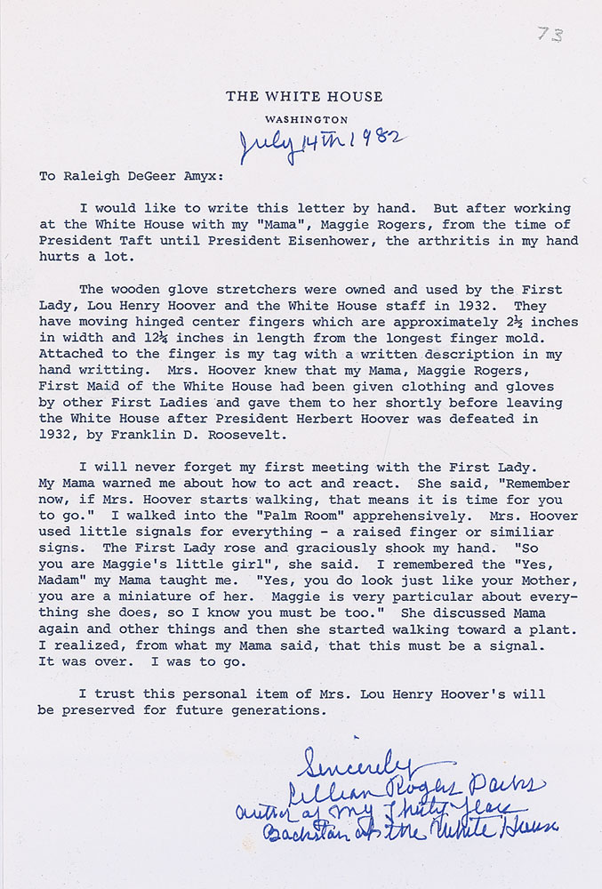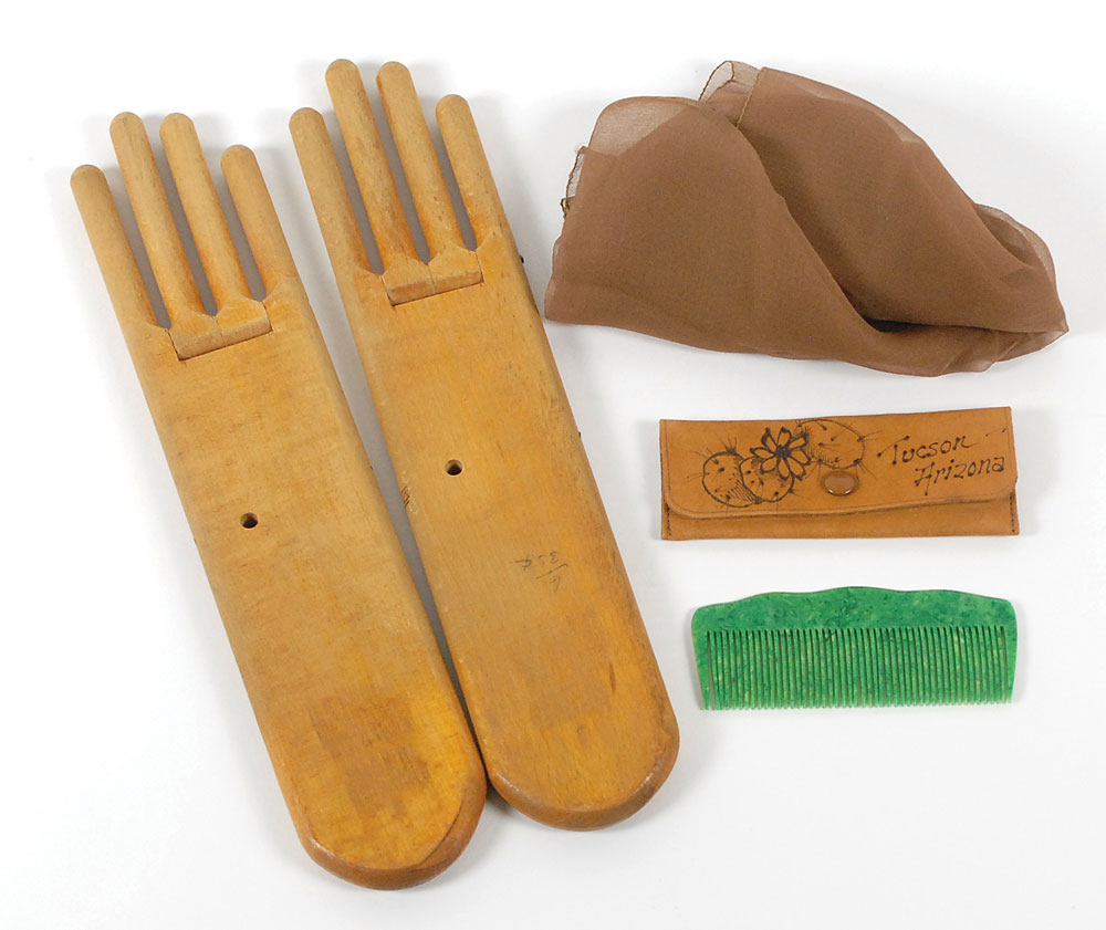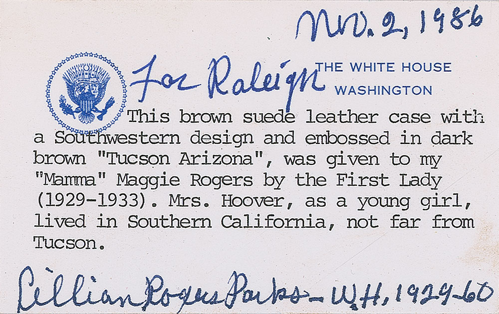 Collection of four items personally-owned and -used by Lou Henry Hoover, all originally presented to White House maid Maggie Rogers. Items are: a pair of wooden glove-stretchers, 2.5 x 12.25; a hand-made light brown chiffon scarf done by White House seamstress Lillian Rogers Parks; a small hand-tooled brown leather case, with a flower and cactus design and embossed, “Tucson, Arizona”; and an attractive 4.75″ green celluloid comb. Each item is accompanied by detailed letters of provenance on White House letterhead from Lillian Rogers Parks, who was a best selling author as well as housekeeper and seamstress at the White House for over 30 years, from President Hoover through President Eisenhower. In the letters Mrs. Parks states both items were presented to her mother Maggie Rogers, who in her role as White House First Maid was often around the First Ladies. In overall fine condition.