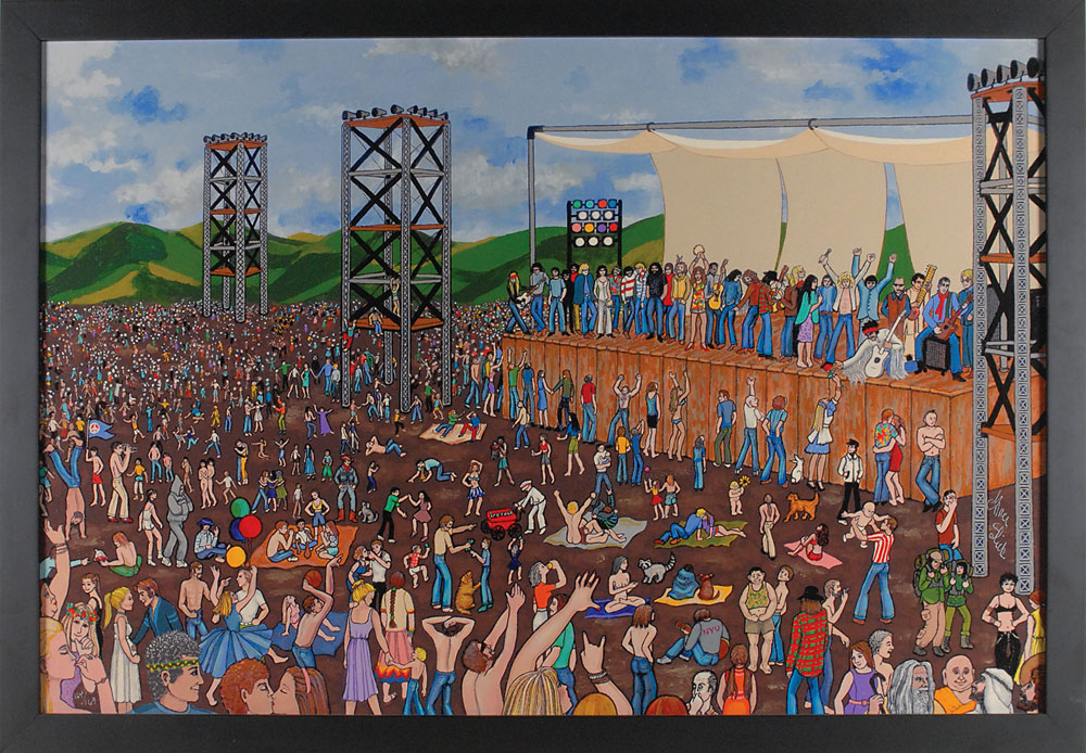 Color giclee print on canvas, 30 x 20, of an original work done by Slick which shows the crowd filing out of Woodstock, with many of the performers on stage bidding them farewell, including Hendrix, The Who, Joe Cocker, and Janis Joplin, as well as individuals in the crowd who did not attend, including Abraham, Jesus, Buddha, Adam and Eve, the White Rabbit, and Alice in Wonderland, 164/169, signed in silver ink by Slick. Framed to an overall size of 32.5 x 22.5. In very fine condition. Pre-certified Roger Epperson/REAL and RR Auction COA.