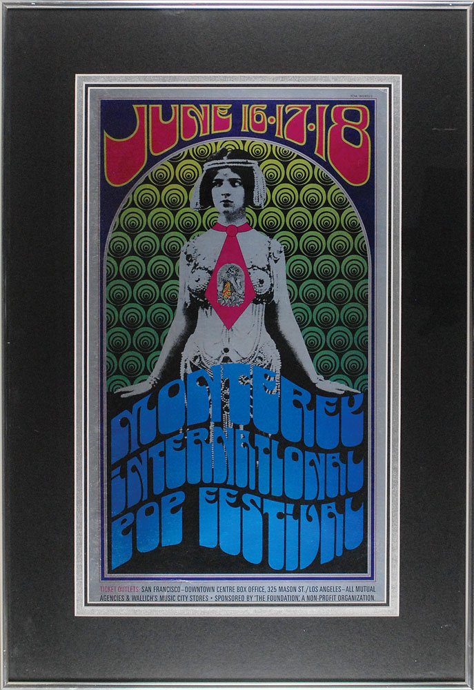 Uncommon original first printing color poster for the Monterey Pop Festival, 12 x 21, featuring artwork by Tom Wilkes. Double-matted and framed to an overall size of 19.25 x 28.25. In fine condition, with some scattered light creases and surface marks. The festival featured early American appearances by the Who and Jimi Hendrix, as well as the first major public appearances by Janis Joplin and Otis Redding. RR Auction COA.