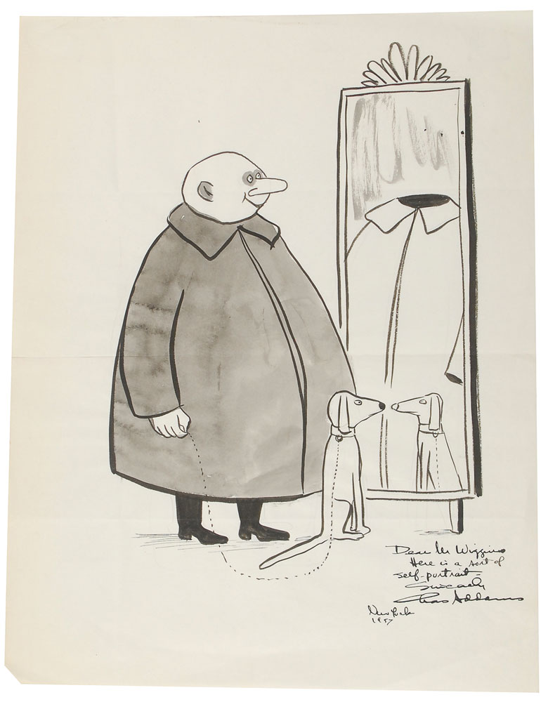 Original vintage signed ink, pencil, and watercolor sketch of Uncle Fester and his dog looking in a mirror, with Fester appearing invisible in his reflection, on an off-white 11.25 x 14 sheet. Signed and inscribed in black ink, “Dear Mr. Wiggins, here is a sort of self-portrait. Sincerely, Chas Addams, New York, 1957.” In fine condition, with light intersecting folds and a few small edge creases. An uncommon and exceptionally large image of one of Addams’s most recognizable and beloved characters. Pre-certified PSA/DNA and RR Auction COA.