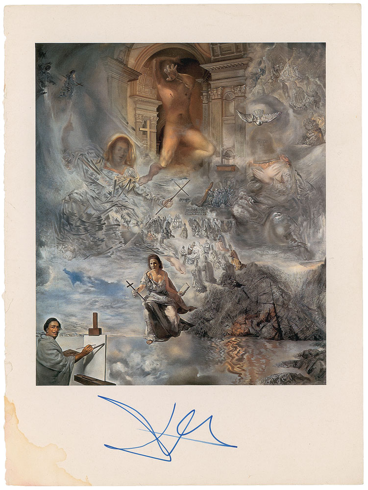 Color 8.75 x 11.75 book photo of Dali’s 1960 surrealist work entitled ‘The Oecumenical Council,’ signed in person in the lower border in blue felt tip. Dampstaining to the lower left corner, otherwise fine condition. Pre-certified PSA/DNA.