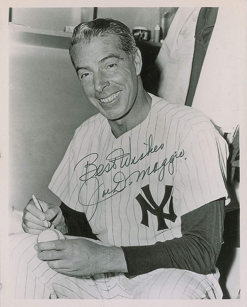 Three items: a color glossy 15.5 x 19.5 photo of DiMaggio sitting on the bench, signed in black felt tip, double-matted to an overall size of 19.75 x 24; a glossy 8 x 10 photo of DiMaggio signing a baseball, signed in black felt tip; and an issue of Yankees Magazine from August 8, 1985, signed on the front cover in blue felt tip. In overall fine condition. RR Auction COA.