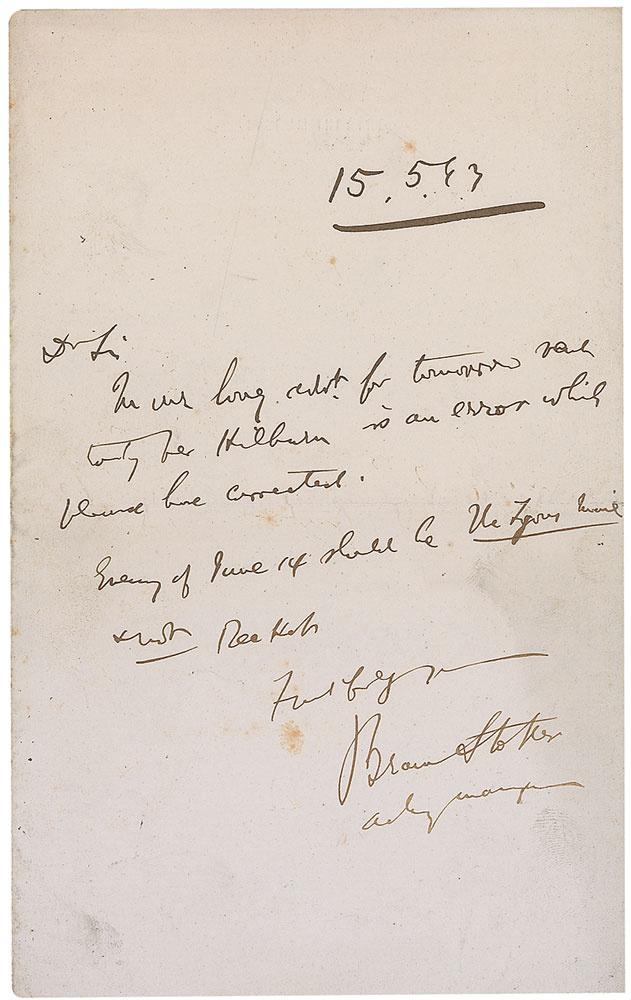 ALS signed “Bram Stoker, Acting Manager,” 5 x 8, blindstamped Lyceum Theatre letterhead, May 15, 1893. Brief letter to a gentleman in his difficult to decipher hand, requesting that an error be corrected. Light scattered foxing and soiling, otherwise fine condition. Stoker worked as business manager for the world-famous Lyceum Theatre in London between 1879 and 1898, where he supplemented his income by writing a large number of sensational novels, his most famous being the vampire tale Dracula published in 1897. Pre-certified PSA/DNA and RR Auction COA.