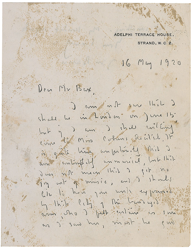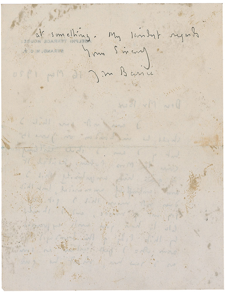 ALS signed “J. M. Barrie,” one page both sides, 5.5 x 7, personal letterhead, May 16, 1920. Letter to English composer and poet Arnold Bax. In part: “I am not sure that I shall be in London…but if I am I shall certainly come to Miss Cohen’s recital. It is quite true unfortunately that I am contemptibly unmusical, but that does not mean that I get no joy out of music, and I should like to hear your work expressed by that lady…who I felt certain as soon as I saw her, must be good at something.” In very good condition, with overall staining affecting the appearance. During this same period, Bax wrote the score for Barrie’s whimsical play The Truth About the Russian Dancers, which was produced by Serge Diaghilev with the Ballets Russes in 1920. Pre-certified PSA/DNA and RR Auction COA.