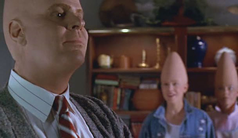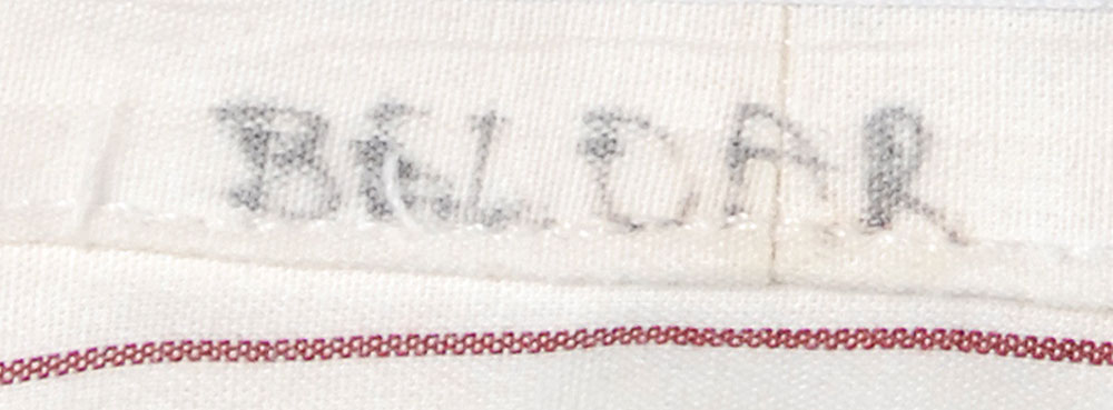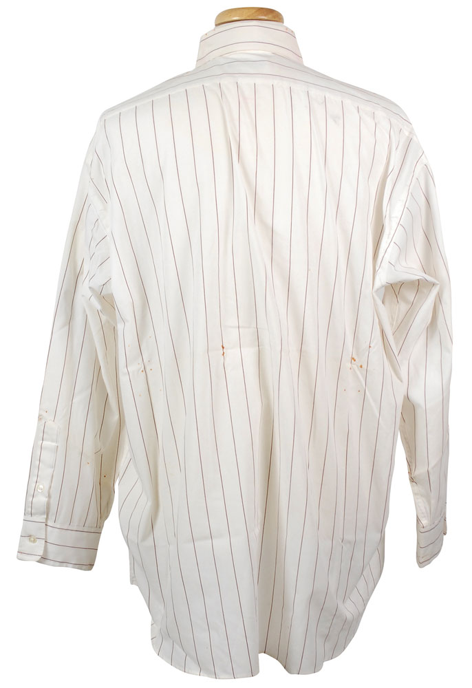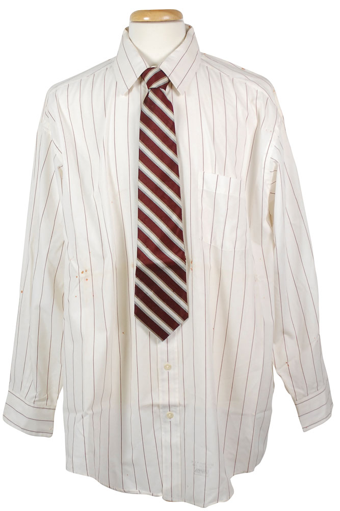 Screen-worn shirt and tie worn by Dan Aykroyd as Beldar in the 1993 film The Coneheads. Long sleeve off-white dress shirt with red pinstripes has a Malibu Collection label sewn into the collar, with “Beldar” written above the tag in black felt tip. Accompanying neck tie is made by Pierre Cardin. Accompanied by the original manila costumer’s tag and a certificate of authenticity from Jules Dean. In very good condition, with scattered small rusty holes. RR Auction COA.
