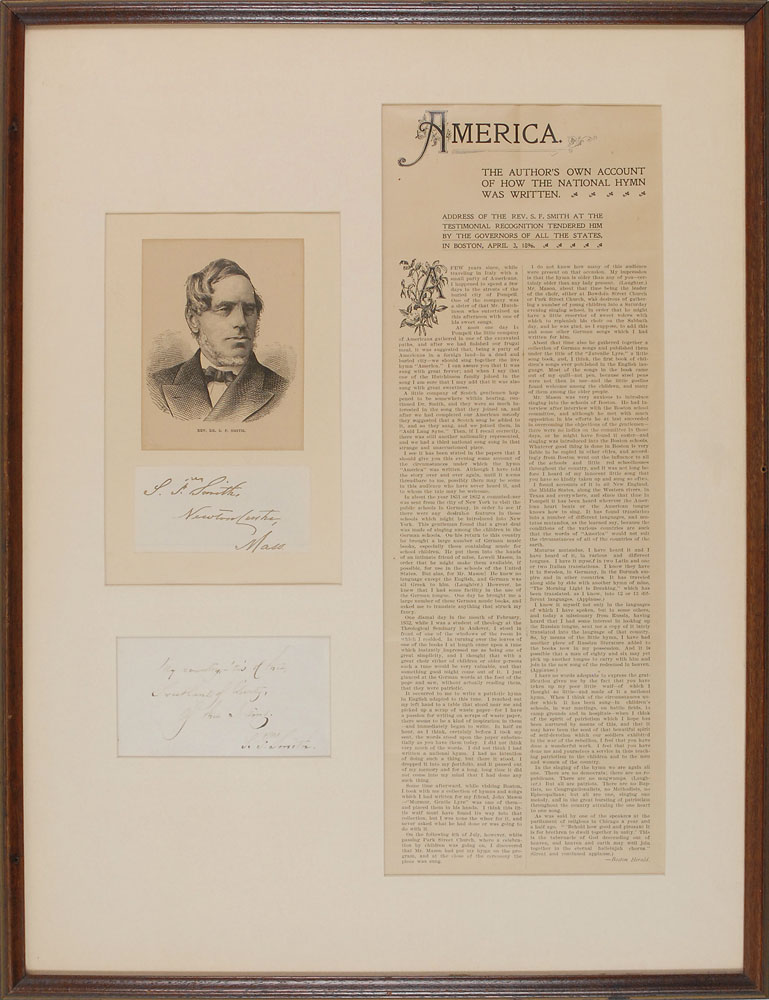 Boston-born Baptist minister and academic (1808–1895) best known as the lyricist of ‘America’ (‘My Country, ’Tis of Thee’), written while he was a student at Andover Theological Seminary. AQS, signed “S. Fr. Smith,” on a 4 x 2.5 off-white sheet. In full: “My country—’tis of thee, Sweet land of liberty, Of thee I sing”; and an ink signature, “S. Fr. Smith, Newton Centre, Mass,” on an off-white slip affixed below an engraved portrait of Smith. Both are matted and framed with a Boston Herald article on Smith’s composition to an overall size of 14.5 x 19. In fine condition. RR Auction COA.