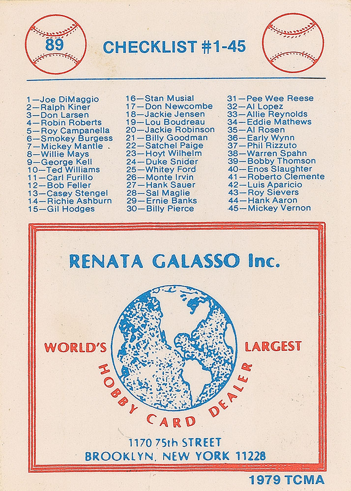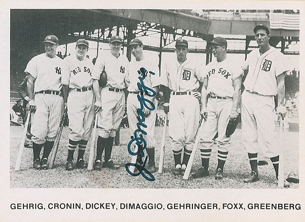 Baseball card depicting the 1937 American League All-Star team from the 1979 TCMA set, signed vertically in black felt tip by DiMaggio over his image. In fine condition. Pre-certified Steve Grad/PSA/DNA and RR Auction COA.