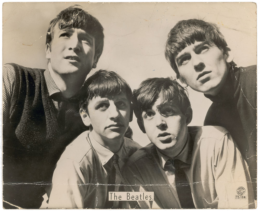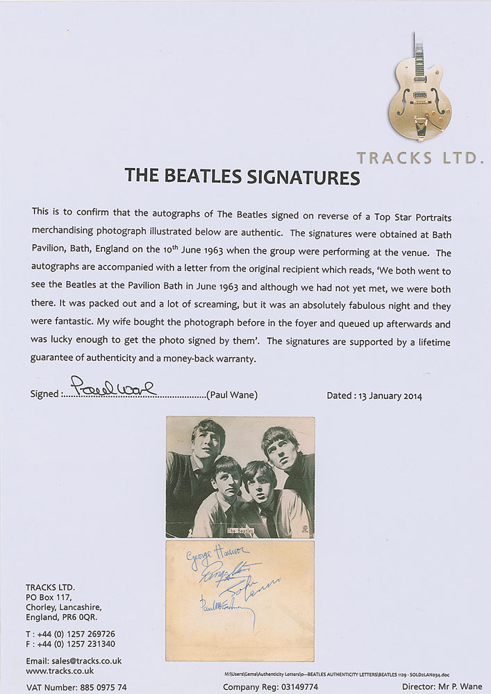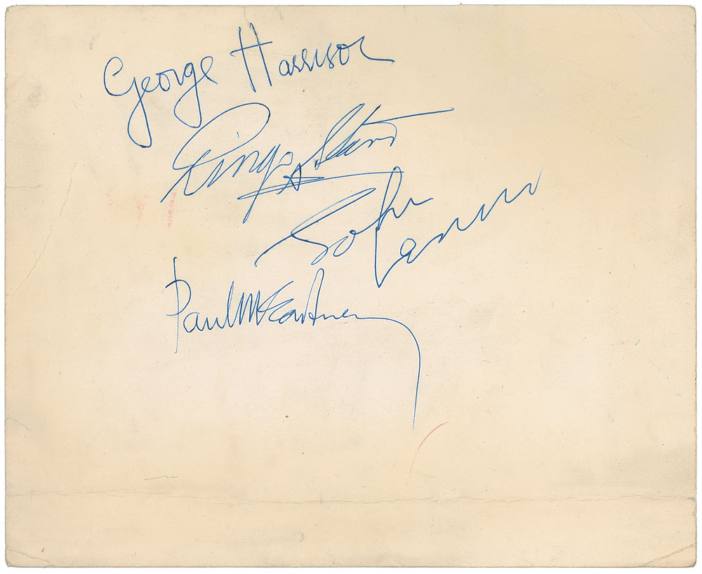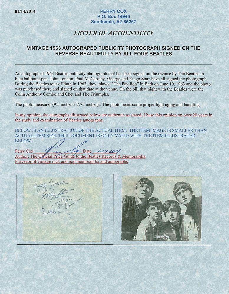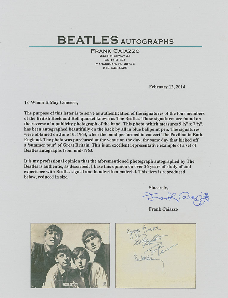 Vintage glossy 9.5 x 7.5 Top Star publicity photo, labeled in the lower right “TS 128,” signed on the reverse in blue ballpoint, “George Harrison,” “Ringo Starr,” “John Lennon,” and “Paul McCartney.” Signatures were obtained at the band’s concert on June 10, 1963, and are accompanied by a letter of provenance which reads, in part: “We both went to see the Beatles at the Pavilion in Bath…My wife bought the photograph in the foyer and queued up afterwards and was lucky to get the photo signed by them.” Also accompanied by a letter of authenticity from Perry Cox, another from Tracks, and two more from noted Beatles expert Frank Caiazzo, who adds, “This is an excellent representative example of a set of Beatles autographs from mid-1963.” In very good to fine condition, with moderate creasing to image side, with light creases to the reverse, as well as a few stray pencil marks and spots of light soiling. Just one day earlier, the Beatles concluded their tour with Roy Orbison—this, their only appearance in Bath, was the kick-off show for their lengthy summer tour. An especially large, bold set of signatures. Pre-certified Roger Epperson/REAL and RR Auction COA.