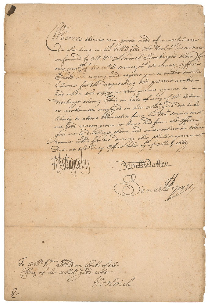 British civil servant (1633–1703) best remembered as the author of a nine-year, multi-volume diary, one of the essential documents of 17th century British history and literature. Manuscript DS in Old English, one page, 7.5 x 11.25, May 17, 1661. Document ordering William Sheldon, Chief of the Navy Yard at Woolwich to hire an additional twelve laborers to work there. Signed at the conclusion by Pepys and countersigned by Sir Robert Slingsby and William Batten. In very good condition, with intersecting folds, one through a single letter of signature, scattered toning and soiling, and a partial separation along hinge to integral second page. Established in 1512 by Henry VIII to build his flagship, the Royal Navy Yard produced several notable vessels, including the HMS Dolphin, and Charles Darwin’s HMS Beagle. Pre-certified PSA/DNA and RR Auction COA.