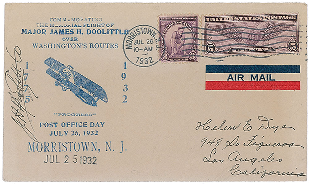 Commemorative cover with a cachet honoring Doolittle’s memorial flight over Washington’s routes on July 26, 1932, signed vertically in fountain pen along the left edge, “J. H. Doolittle.” In fine condition, with an address written in the lower right corner and a mild shade of uniform toning. Pre-certified PSA/DNA and RR Auction COA.