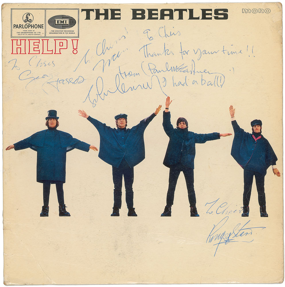 Ultra-rare UK mono edition of the Beatles Help! album, crisply signed and inscribed on the front cover in blue ballpoint, “To Chris, George Harrison,” “To Chris, thanks from John Lennon,” “To Chris, Thanks for your time!!! Paul McCartney, I had a ball!,” and “To Chris, Ringo Starr.” Album was signed in 1967, two years after its release, and is accompanied by a letter from the daughter of the original recipient, which reads, in part: “In 1967 Dad had the Beatles sign this mono Help album…Dad helped out with the Peggy Spencer dancing school on making a pop video with the Beatles. It was for a dance sequence for the song Your Mother Should Know. On completion of the video the Beatles autographed the album for my dad.” In very good condition, with some expected light skipping to signatures, scattered creases, and some toning and soiling. Choreographed by Peggy Spencer as a grand production number for Magical Mystery Tour, the routine for ‘Your Mother Should Know’ was reminiscent of an old-time dance number, with the band, clad in white tuxedos, dancing down a large staircase. By this time, the Beatles had largely withdrawn from public life and were virtually inaccessible to the public, making anything signed during this period incredibly rare. Greatly enhanced by the desirable placement of the signatures on the front cover, this is one of the finest examples we have seen—and the only complete band-signed Help! album we have ever offered. Pre-certified Roger Epperson/REAL and RR Auction COA.