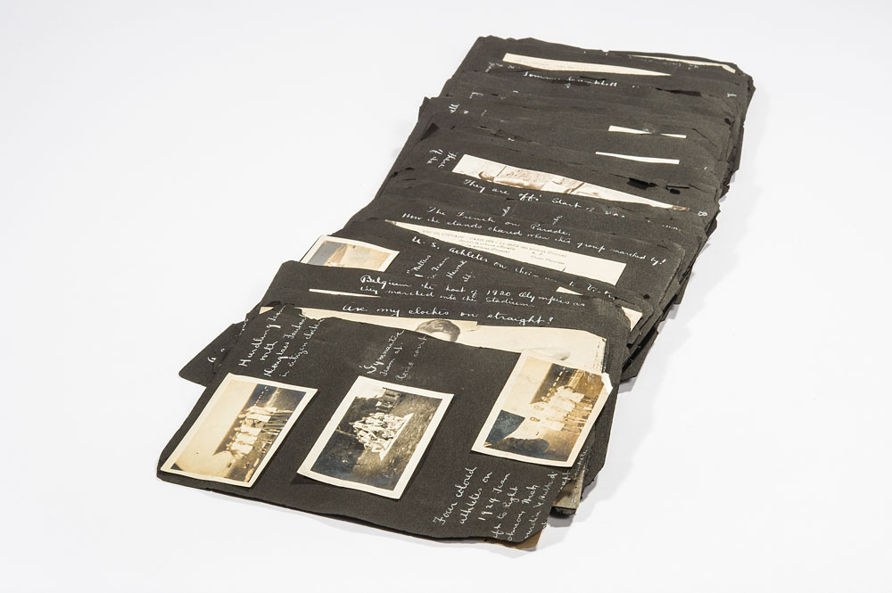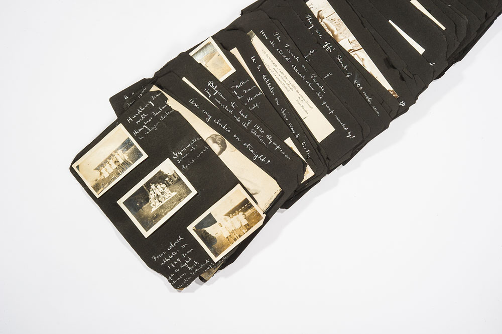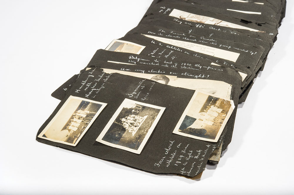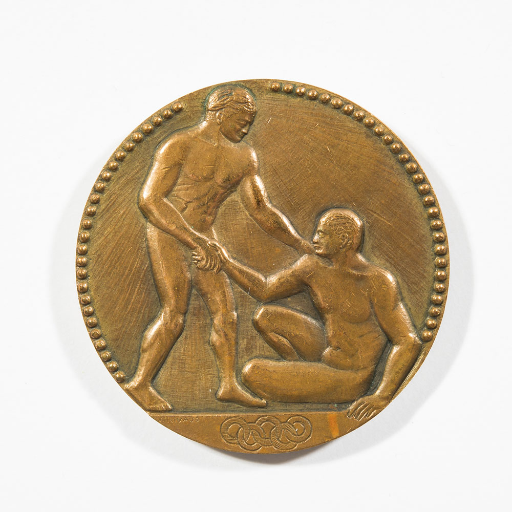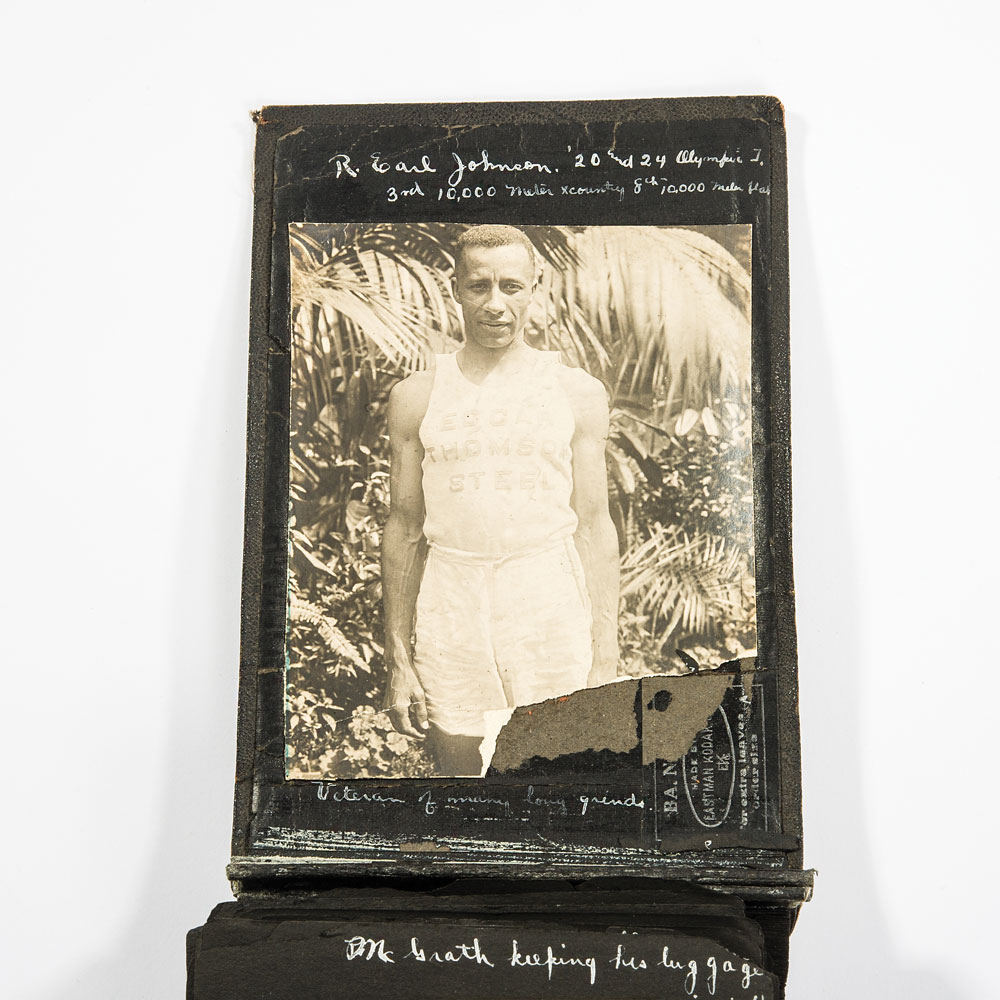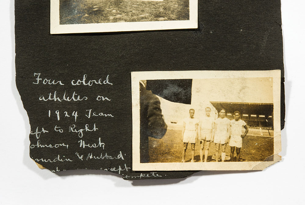 The 1924 Summer Games bronze winners medal presented to groundbreaking African-American US runner R. Earl Johnson. Medal is approximately 55mm in diameter and weighs approximately 76 grams. The winners medal was struck by the Paris mint and was designed by Andre Rivaud, and is stamped along the edge “Bronze.” One side of the medal features a winning athlete helping up his defeated foe and the artist’s signature along the bottom, with the reverse having a raised relief of various pieces of sporting equipment, with the artist’s initials below them, and “VIII eme Olympiade Paris 1924,” in raised letters. In extra fine plus to near uncirculated condition. Included is an expansive photo album full of photos and postcards from the 1924 Olympic Games, complete with Earl Johnson’s own handwritten captions, including a photo of Johnson posing with other members of the track team.