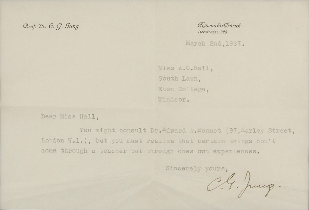 TLS signed “C. G. Jung,” one page, 8 x 5.5, personal letterhead, March 2, 1937. Letter to Miss A. C. Hall. In full: “You might consult Dr. Edward A. Bennet (97, Harley Street, London W. 1.) but you must realize that certain things don’t come through a teacher but through ones own experiences.” Double-matted and framed with a portrait of Jung to an overall size of 19.5 x 11. In fine condition, with central horizontal and vertical folds and a few light creases to lower portion, a couple passing through (but not affecting) signature. Edward Bennet was a longtime friend of Jung’s, who wrote two major works on the psychologist, and was integral in establishing Jung’s ideas in England. Pre-certified PSA/DNA and RR Auction COA.