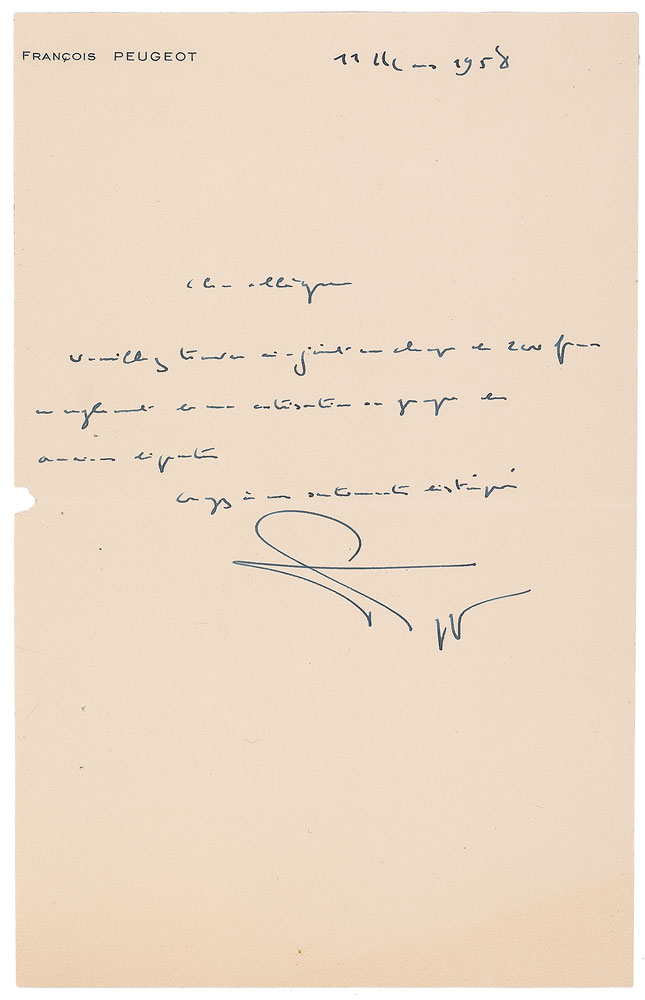 French industrialist and politician (1901–1985) who took an increasingly important role in his family’s automobile company before running for political office. Scarce untranslated ALS in French, one page, 4.75 x 7.5, personal letterhead, March 11, 1958. In fine condition, with a tiny chip to the left edge. RR Auction COA.