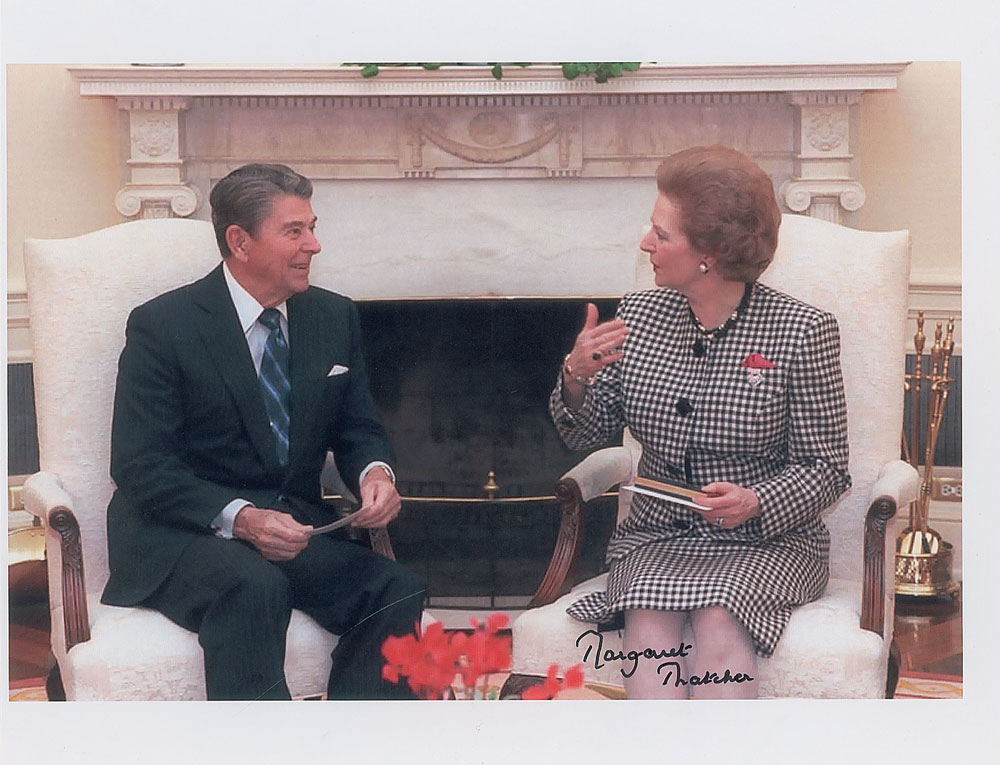 Color 11 x 8.5 laser print photo of Thatcher and Ronald Reagan conversing in the Oval Office, signed in black felt tip. In fine condition. Pre-certified PSA/DNA and RR Auction COA.