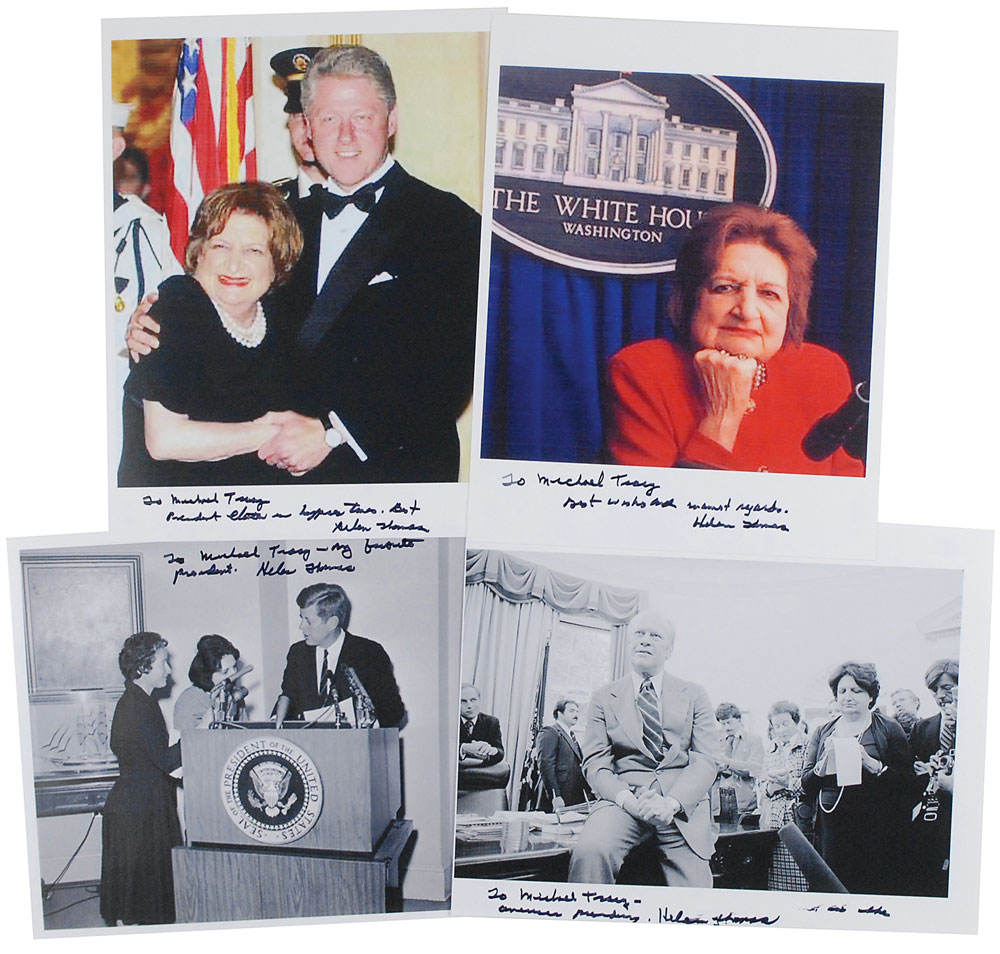 American author and news service reporter (1920-2013), and a member of the White House press corps who served as the bureau manager of United Press International. Four laser print photos, two 8.5 x 11 and two 11 x 8.5, including images of Thomas with Presidents Kennedy, Ford, and Clinton, each signed and inscribed in black felt tip. In fine condition, with brushing to one signature and a couple of the images slightly grainy. RR Auction COA.