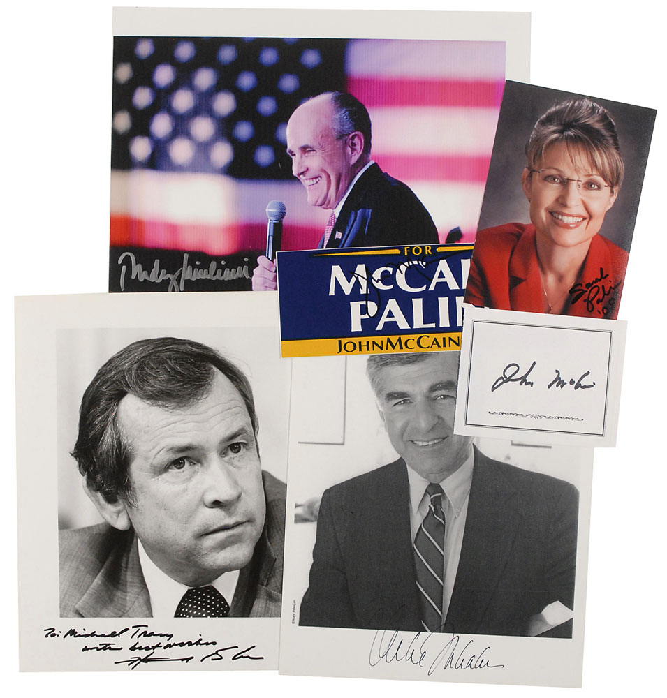 Collection of six items, each signed by a prominent politician. Signers are: Rudy Giuliani (SP), Sarah Palin (SP), Michael Dukakis (SP), Howard Baker (SP), and John McCain (bookplate and campaign sticker). In fine condition. RR Auction COA.
