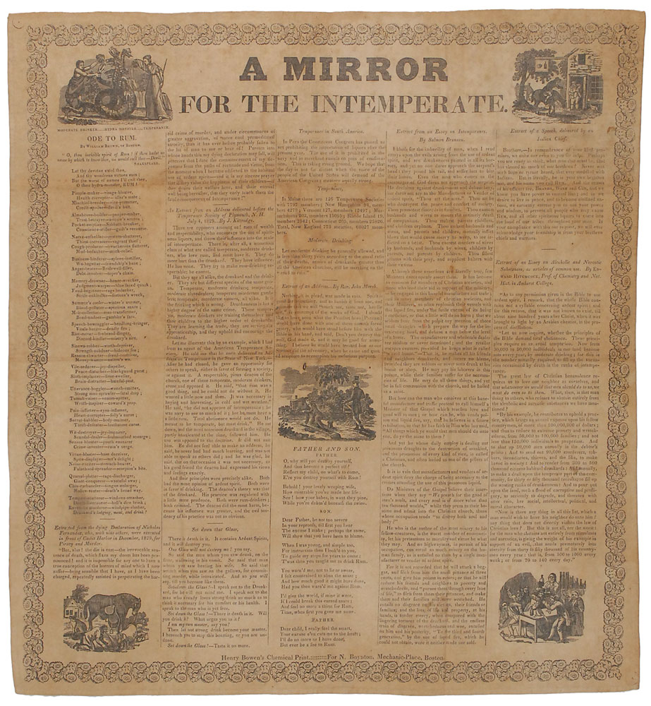 Rare American Temperance Broadside, printed on linen, 17.25 x 19, stitched at the edges. Titled "A Mirror for the Intemperate," printed in five columns with five vignettes illustrating the hazards of drinking accompanied by verse (’Ode to Rum’ and ‘Father and Son’), essays by Prof. Edward Hitchcock and Salmon Bronson, and speeches by J. Kittredge, a condemned murderer, as well as an Indian Chief. There are also news reports (Peru has passed a law prohibiting the importation of liquor), and facts (number of temperance societies in New England by state). Imprinted at the lower edge, just with the scrolling floral and leaf border: "Henry Bowen's Chemical Print....For N. Boynton, Mechanic-Place, Boston." Storage folds, some scattered light foxing and soiling, and pinholes to corners, otherwise fine condition. RR Auction COA.