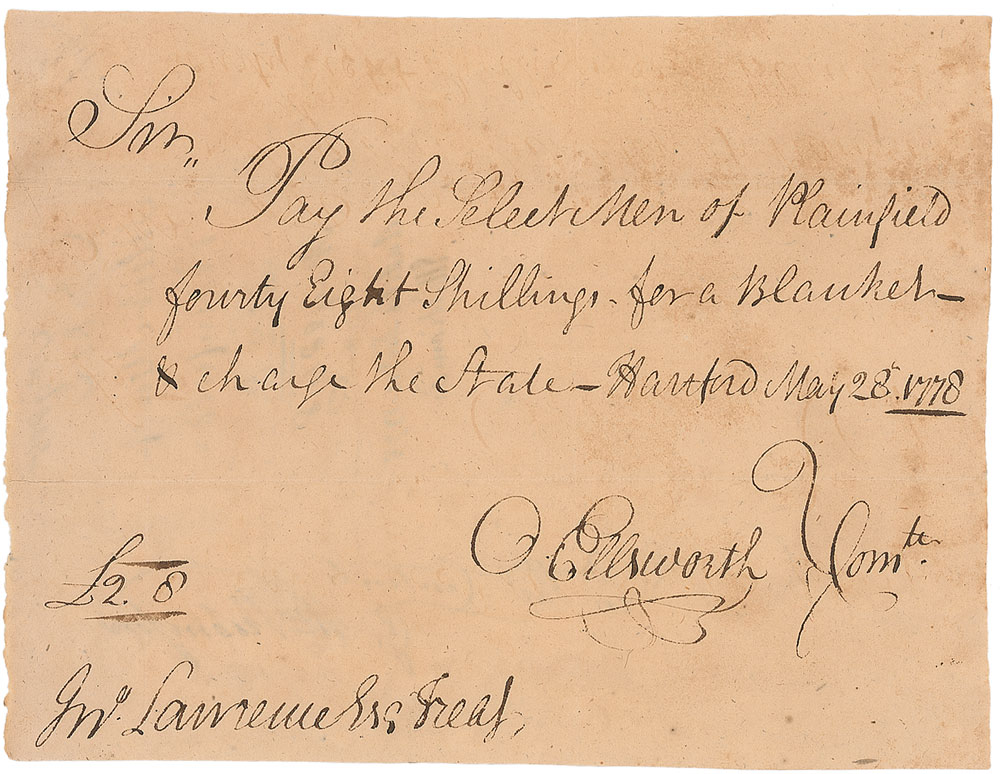 Revolutionary War–dated ADS, signed “O. Ellsworth,” one page, 7.25 x 5.5, May 28, 1778. Pay order in which Ellsworth directs John Lawrence, treasurer of the state of Connecticut, to “pay the Select Men of Plainfield fourty Eight Shillings for a Blanket—& charge the State.” Ellsworth also penned a few lines of docketing to the reverse. In fine condition, with expected document wear. Pre-certified PSA/DNA and RR Auction COA.