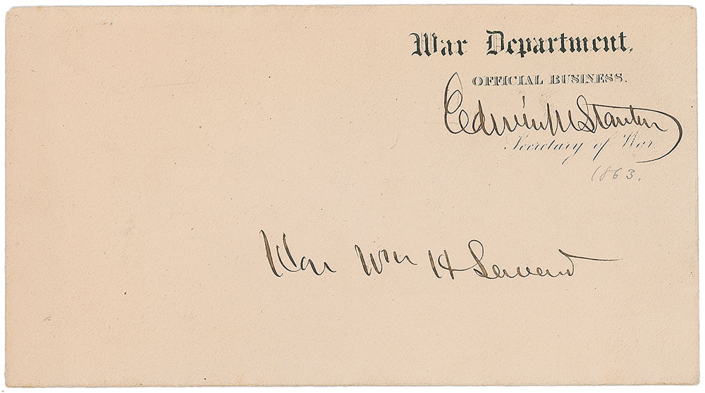 War Department official business envelope, 6.25 x 3.5, addressed in another hand to “Hon. Wm. Seward,” and signed in the upper right, “Edwin M. Stanton.” In fine condition, with a small pencil notation under signature. Pre-certified PSA/DNA and RR Auction COA.