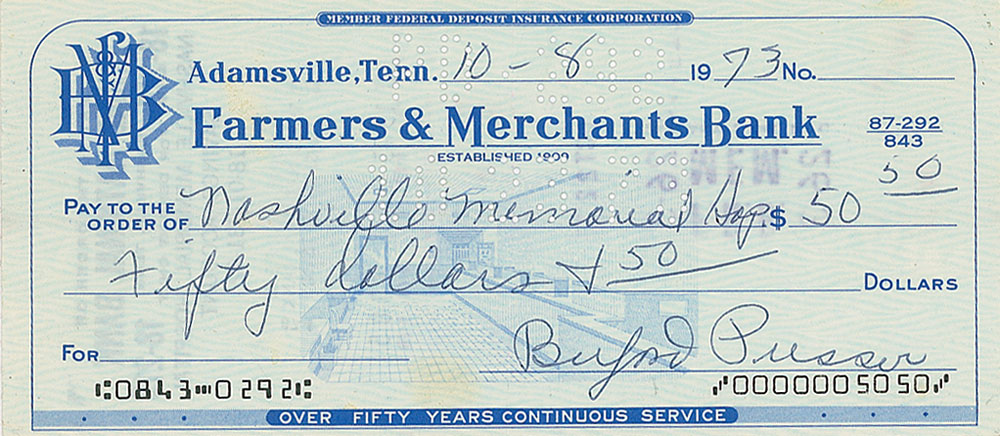 Legendary no-nonsense Tennessee lawman (1937–1974) whose story was adapted into the popular Walking Tall films. Bank check, 6.25 x 2.75, filled out and signed by Pusser, payable to Nashville Memorial Hop. for $50, October 8, 1973. In fine condition, with expected cancellation holes and a couple subtle stains. RR Auction COA.