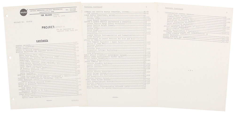 Original and complete unbound Apollo 11 press kit, 8.25 x 10.5, 250 pages, providing very detailed information and diagrams related to the first moonwalks. In fine condition.