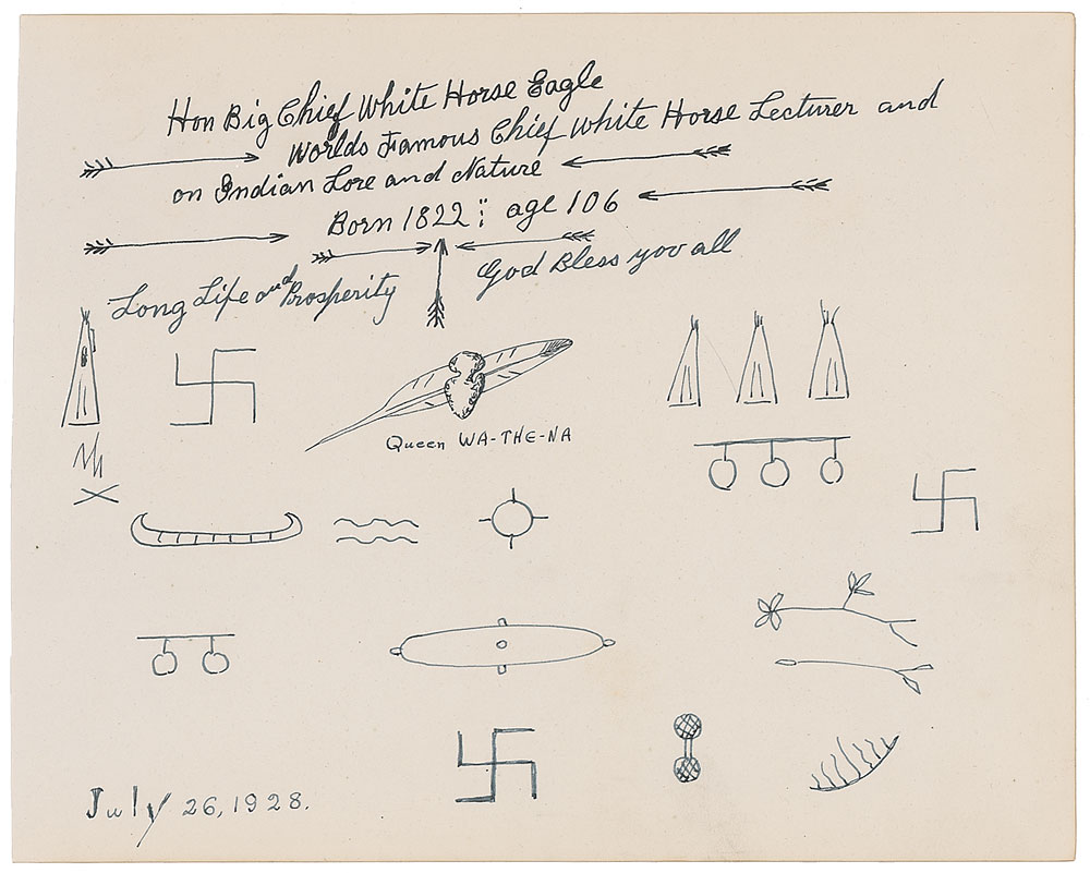 Large ink signatures, “Hon. Big Chief White Horse Eagle, Worlds Famous Chief White Horse Lecturer and on Indian Lore and Nature, Born 1822: age 106, Long Live and Prosperity, God bless you all,” adding sketches of arrows around his signatures, and “Queen Wa-The-Na,” on an off-white 11.5 x 9 sheet, with Queen Wa-The-Na adding many sketches of Native American symbols and items. In fine condition. RR Auction COA.