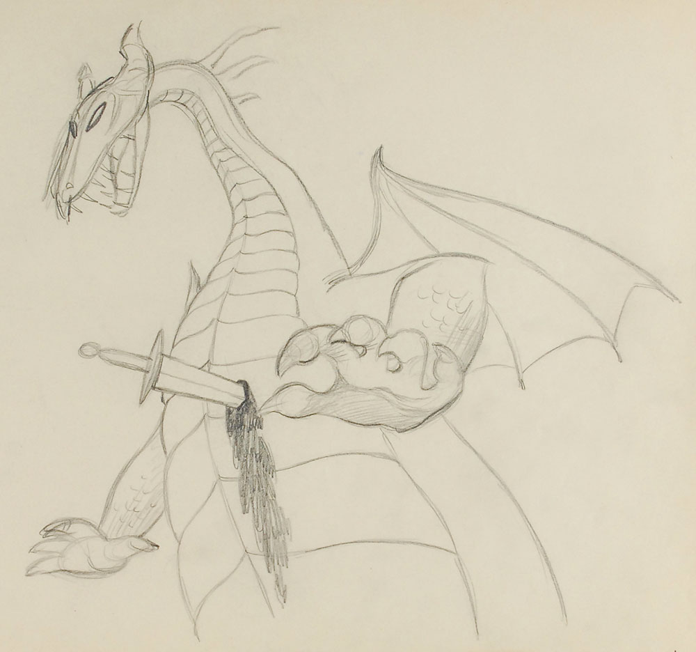 (Walt Disney Studios, 1959) Original ‘rough’ production drawing featuring Maleficent as the Dragon from Sleeping Beauty. Accomplished in graphite on untrimmed 15.5 x 12.5 animation paper. Image measures 11.5 x 11 and shows the dragon pierced with Prince Phillip’s ‘sword of truth’ at the climax of the film. In fine condition.