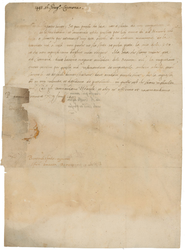 Duchess of Bari and later of Milan (1475–1497) who was the wife of the Milanese ruler Ludovico Sforza. LS in Italian, signed “Beatrudes,” one page, 8.25 x 11.25, 1493. Crisply-penned untranslated letter, signed along the bottom edge by Beatrice. Letter has been professionally silked on the reverse and has been encapsulated in Mylar. In very good condition, with intersecting folds, scattered light toning and soiling, light show-through from docketing on reverse, and several repaired areas of paper loss. An incredibly scarce offering of one of the most beautiful and accomplished princesses of the Italian Renaissance. RR Auction COA.