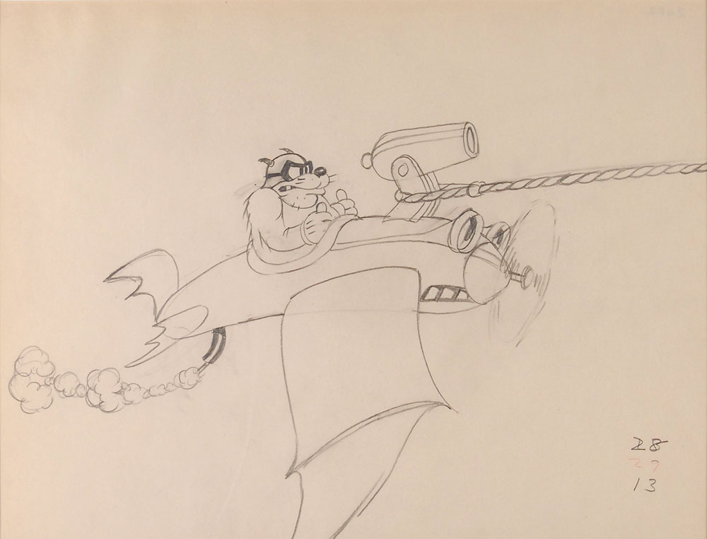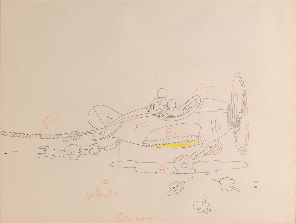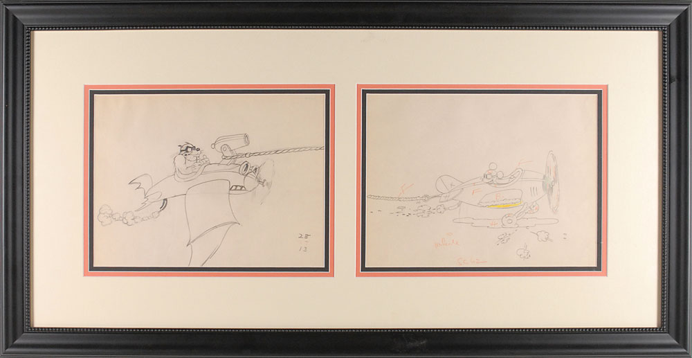 (Walt Disney Studios, 1933) Pair of original production drawings featuring Mickey Mouse and Peg Leg Pete from The Mail Pilot, showing Mickey in his plane after getting his wings shot off, showing him dragging Pete’s plane through the air on a rope. Accomplished in graphite and colored pencil on two sheets of animation paper. Images measure 11 x 6.5 and 9.5 x 5.5, with mat openings of 11 x 8.5. This piece is also framed to an overall size of 33.75 x 18. In fine condition. A nice pairing of production sketches.
